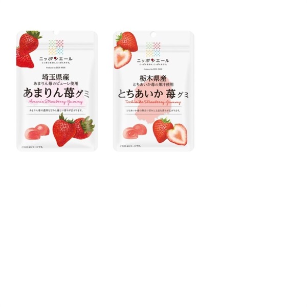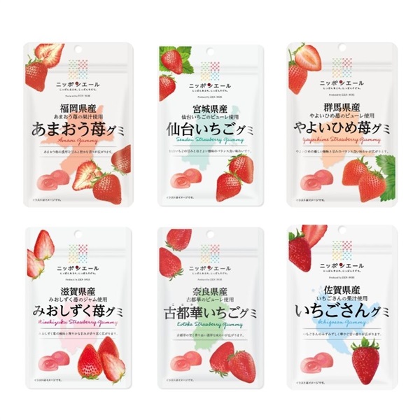 福岡県産あまおう苺グミ、宮城県産仙台いちごグミ、群馬県産やよいひめ苺グミ、滋賀県産みおしずく苺グミ、奈良県産古都華いちごグミ、佐賀県産いちごさんグミ、埼玉県産あまりん苺グミ、栃木県産とちあいか苺グミ