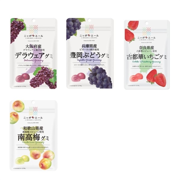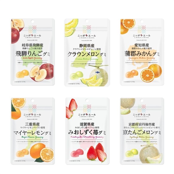 岐阜県飛騨産飛騨りんごグミ、静岡県産クラウンメロングミ、愛知県産蒲郡みかんグミ、三重県産マイヤーレモングミ、滋賀県産みおしずく苺グミ、京都府京丹後市産京たんごメロン、大阪府産デラウェアグミ、兵庫県産豊岡ぶどうグミ、奈良県産古都華いちごグミ、和歌山県産南高梅グミ