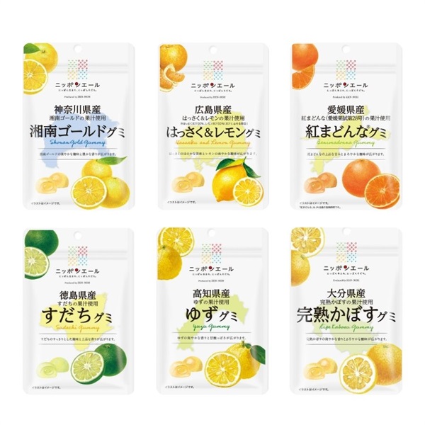 神奈川県産湘南ゴールドグミ、広島県産はっさく&レモングミ、愛媛県産紅まどんなグミ、徳島県産すだちグミ、高知県産ゆずグミ、大分県産完熟かぼすグミ、愛知県産蒲郡みかんグミ、三重県産マイヤーレモングミ、山口県産ゆめほっぺグミ、長崎県産長崎恋みかんグミ