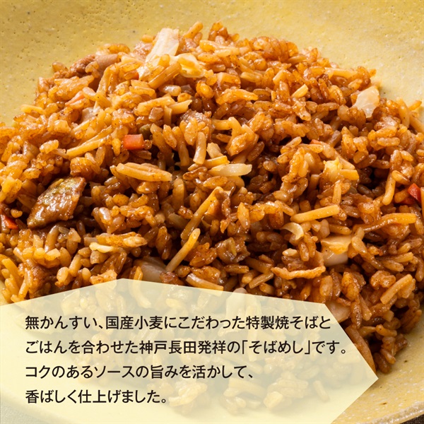 無かんすい、国産小麦にこだわった特製焼そばとごはんを合わせた神戸長田発祥の「そばめし」です。